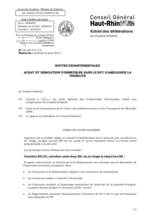 L'achat et la démolition d'immeubles, gênant la visibilité à des carrefours et en virages le long de RD, ont fait l'objet par le passé de stratégies variées. Eu égard aux difficultés engendrées par le mode opératoire actuel, il est proposé de revenir sensiblement à ce qui était pratiqué par le Conseil Général avant 1987.