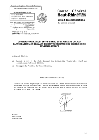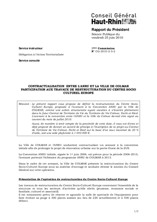 CONTRACTUALISATION ENTRE L'ANRU ET LA VILLE DE COLMAR PARTICIPATION AUX TRAVAUX DE RESTRUCTURATION DU CENTRE SOCIO CULTUREL EUROPE