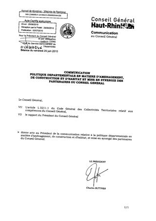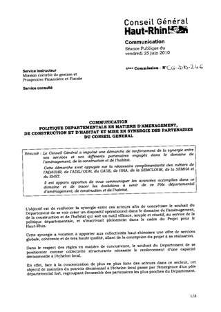 COMMUNICATION POLITIQUE DEPARTEMENTALE EN MATIERE D'AMENAGEMENT DE CONSTRUCTION ET D'HABITAT ET MISE EN SYNERGIE DES PARTENAIRES DU CONSEIL GENERAL Resumé Pièces jointes DELIBERATION RAPPORT Assemblée : Conseil General Date : 25/06/2010 Rapporteur : Non défini Collectivité : Conseil départemental du Haut-Rhin Direction : Non défini Service : Mission Contrôle de Gestion et Organisation Domaine : Habitat Commission : Assemblée Départementale