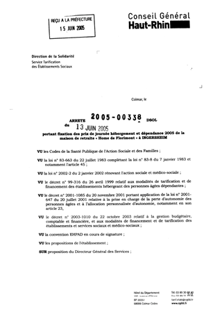 portant fixation des prix de journée hébergement et dépendance 2005 de la maison de retraite "Home de Florimont" à INGERSHEIM. Resumé Pièces jointes ARRETE Assemblée : Non défini Date : 13/06/2005 Rapporteur : Non défini Collectivité : Conseil départemental du Haut-Rhin Direction : Non défini Service : Service de la Tarification des Etablissements Domaine : Prix de Journée Commission :