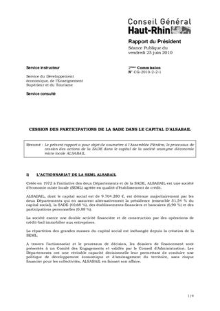 Le présent rapport a pour objet de soumettre à l'Assemblée Plénière, le processus de cession des actions de la SADE dans le capital de la société anonyme d'économie mixte locale ALSABAIL.