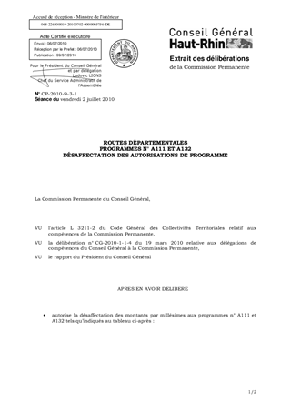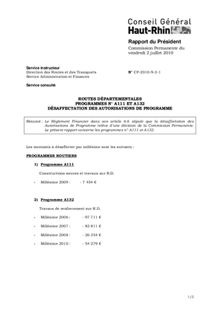Le Règlement Financier dans son article 6.6 stipule que la désaffectation des Autorisations de Programme relève d’une décision de la Commission Permanente. Le présent rapport concerne les programmes n° A111 et A132.