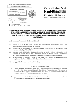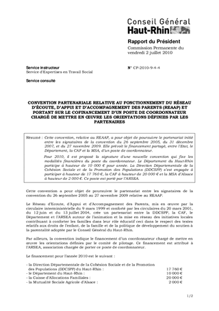 Cette convention, relative au REAAP, a pour objet de poursuivre le partenariat initié entre les signataires de la convention du 26 septembre 2005, du 31 décembre 2007, et du 27 novembre 2009. Elle prévoit le financement partagé, entre l'Etat, le Département, la CAF et la MSA, d’un poste de coordonnateur. Pour 2010, il est proposé la signature d'une nouvelle convention qui fixe les modalités financières du poste du coordonnateur. Le Département du Haut-Rhin participe à hauteur de 10 000 € pour année. La Direction Départementale de la Cohésion Sociale et de la Promotion des Populations (DDCSPP) s’est engagée à participer à hauteur de 17 760 €, la CAF à hauteur de 20 000 € et la MSA d’Alsace à hauteur de 2 000 €. Ce poste est porté par l’ARSEA.