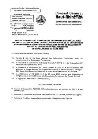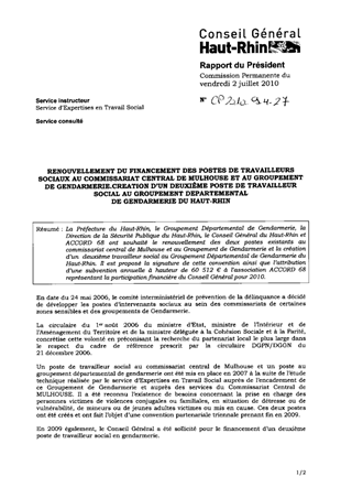 RENOUVELLEMENT DU FINANCEMENT DES POSTES DE TRAVAILLEURS SOCIAUX AU COMMISSARIAT CENTRAL DE MULHOUSE ET AU GROUPEMENT DE GENDARMERIE CREATION D'UN DEUXIEM POSTE DE TRAVAILLEUR SOCIAL AU GROUPEMENT DEPARTEMENTAL DE GENDARMERIE DU HAUT RHIN Resumé Pièces jointes DELIBERATION RAPPORT Assemblée : Commission Permanente Date : 02/07/2010 Rapporteur : Non défini Collectivité : Conseil départemental du Haut-Rhin Direction : Non défini Service : Service d'Expertises en Travail Social Domaine : Aides / Subventions Commission : Commission Permanente
