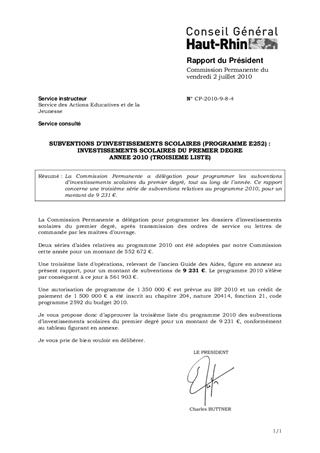 SUBVENTIONS D'INVESTISSEMENTS SCOLAIRES (PROGRAMME E252) : INVESTISSEMENTS SCOLAIRES DU PREMIER DEGRE ANNEE 2010 (TROISIEME LISTE)