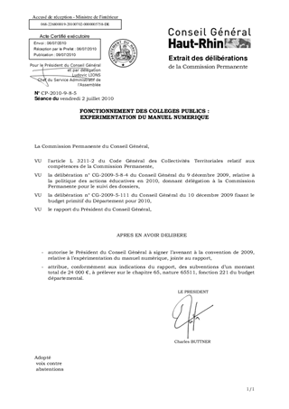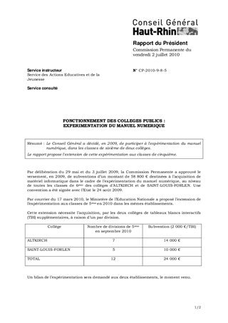 Le Conseil Général a décidé, en 2009, de participer à l'expérimentation du manuel numérique, dans les classes de sixième de deux collèges. Le rapport propose l'extension de cette expérimentation aux classes de cinquième.