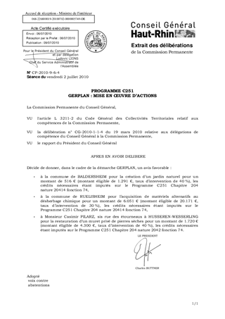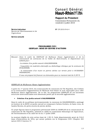 Dans le cadre du GERPLAN de Mulhouse Alsace Agglomération et de la communauté de communes de la Vallée de Saint-Amarin, le Département est sollicité pour : - la création d’un jardin naturel à BALDERSHEIM, - l’acquisition de matériels alternatifs au désherbage chimique par la commune de RUELISHEIM, - la restauration d’un muret en pierres sèches sur terrain privé à HUSSEREN-WESSERLING. Il vous est proposé de financer ces demandes pour un montant total de 8.287 €.