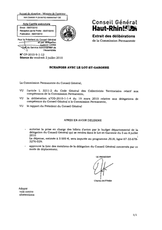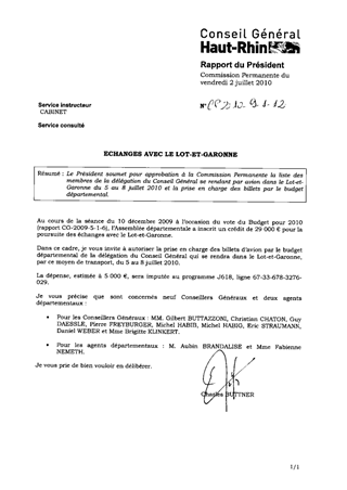 ECHANGES AVEC LE LOT-ET-GARONNE Resumé Pièces jointes DELIBERATION RAPPORT Assemblée : Commission Permanente Date : 02/07/2010 Rapporteur : Non défini Collectivité : Conseil départemental du Haut-Rhin Direction : Non défini Service : Cabinet Domaine : Administration Commission : Commission Permanente