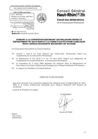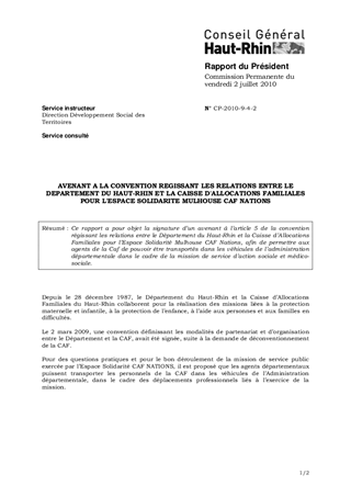 AVENANT A LA CONVENTION REGISSANT LES RELATIONS ENTRE LE DEPARTEMENT DU HAUT-RHIN ET LA CAISSE D'ALLOCATIONS FAMILIALES POUR L'ESPACE SOLIDARITE MULHOUSE CAF NATIONS