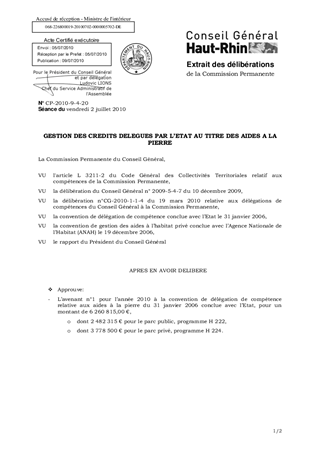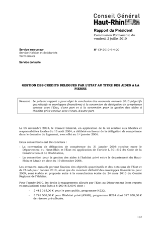 Le présent rapport a pour objet la conclusion des avenants annuels 2010 (objectifs quantitatifs et enveloppes financières) à la convention de délégation de compétence conclue avec l’Etat, d'une part et à la convention pour la gestion des aides à l'habitat privé conclue avec l’Anah, d'autre part.