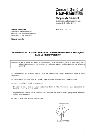 Il est proposé de verser à l'association "Lieux Mythiques dans le Rhin Supérieur", dont le Département est membre, la cotisation au titre de l'année 2010 qui s'élève à 2000 €.