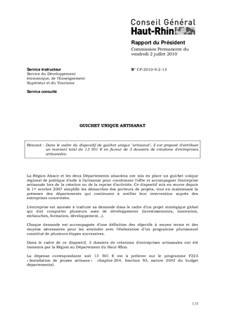 Dans le cadre du dispositif de guichet unique "artisanat", il est proposé d'attribuer un montant total de 13 501 € en faveur de 3 dossiers de créations d'entreprises artisanales.