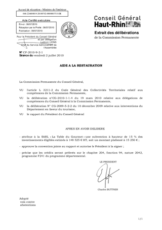 Il est proposé d'accorder une subvention plafonnée à 15 250 € en faveur de la Sàrl "La Table du Gourmet" à RIQUEWIHR pour la réalisation de travaux de rénovation.