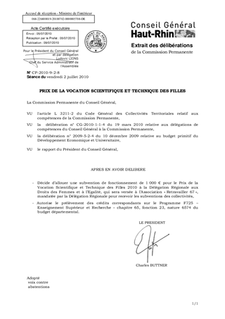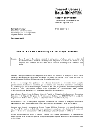 Dans le cadre du présent rapport, il est proposé d'allouer une subvention de fonctionnement de 1 000 € à la Délégation Régionale aux Droits des Femmes et à l'Egalité pour l'édition 2010 du Prix de la Vocation Scientifique et Technique des Filles.