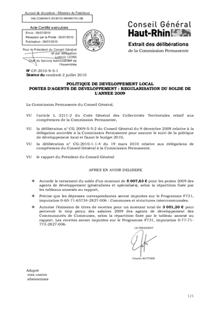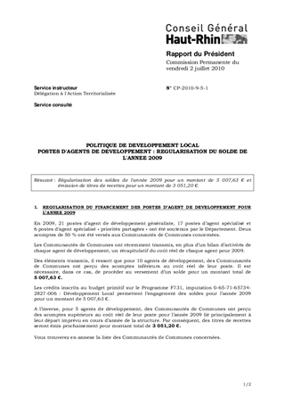 POLITIQUE DE DEVELOPPEMENT LOCAL POSTES D'AGENTS DE DEVELOPPEMENT : REGULARISATION DU SOLDE DE L'ANNEE 2009