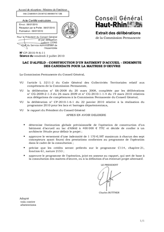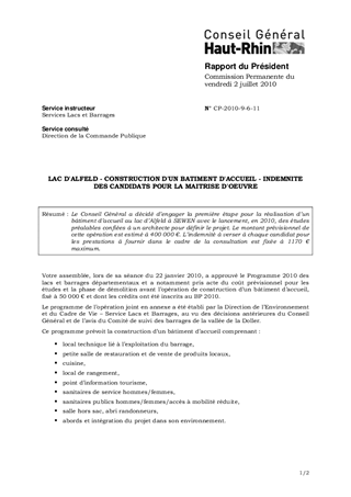 Le Conseil Général a décidé d’engager la première étape pour la réalisation d’un bâtiment d’accueil au lac d’Alfeld à SEWEN avec le lancement, en 2010, des études préalables confiées à un architecte pour définir le projet. Le montant prévisionnel de cette opération est estimé à 400 000 €. L’indemnité à verser à chaque candidat pour les prestations à fournir dans le cadre de la consultation est fixée à 1170 € maximum.