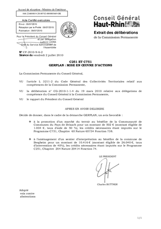 Dans le cadre du GERPLAN des communautés de communes du Pays de Brisach et du Pays de Ribeauvillé, le Département est sollicité pour : - la promotion d’un marché du terroir, - la réalisation d’un sentier d’interprétation à Bergheim / Saint Hippolyte. Il vous est proposé de financer ces demandes pour un montant total de 10.918 €.