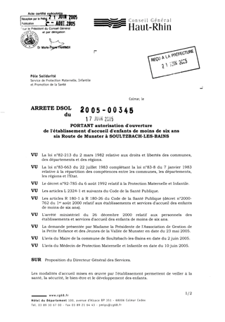 portant autorisation d'ouverture de l'établissement d'accueil d'enfants de moins de six ans sis route de Munster à SOULTZBACH LES BAINS. Resumé Pièces jointes ARRETE Assemblée : Non défini Date : 17/06/2005 Rapporteur : Non défini Collectivité : Conseil départemental du Haut-Rhin Direction : Non défini Service : Service de Protection Maternelle et Infantile Domaine : Accueil d'enfants Commission :
