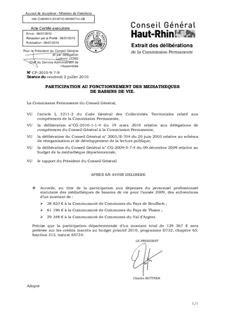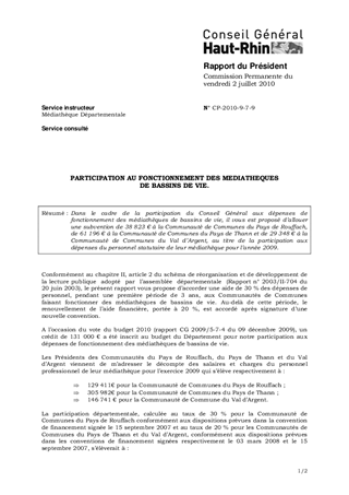 Dans le cadre de la participation du Conseil Général aux dépenses de fonctionnement des médiathèques de bassins de vie, il vous est proposé d’allouer une subvention de 38 823 € à la Communauté de Communes du Pays de Rouffach, de 61 196 € à la Communauté de Communes du Pays de Thann et de 29 348 € à la Communauté de Communes du Val d’Argent, au titre de la participation aux dépenses du personnel statutaire de leur médiathèque pour l’année 2009.