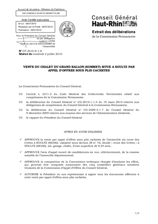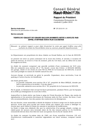Le présent rapport a pour objet d'autoriser la vente par appel d'offres sous plis cachetés du chalet du Grand Ballon situé au sommet, propriété départementale.