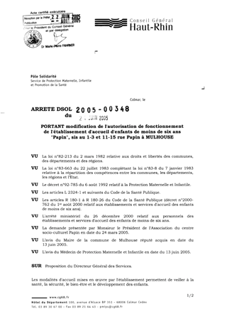 portant modification de l'autorisation de fonctionnement de l'établissement d'accueil d'enfants de moins de six ans "Papin", sis au 1-3 et 11-15 rue Papin à MULHOUSE. Resumé Pièces jointes ARRETE Assemblée : Non défini Date : 21/06/2005 Rapporteur : Non défini Collectivité : Conseil départemental du Haut-Rhin Direction : Non défini Service : Service de Protection Maternelle et Infantile Domaine : Accueil d'enfants Commission :