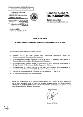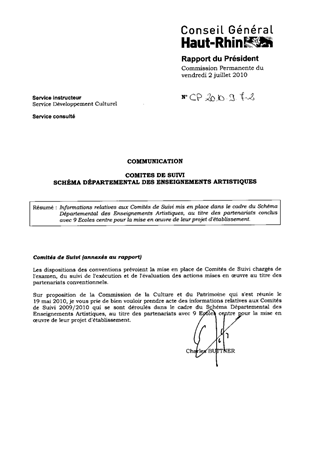 COMMUNICATION COMITES DE SUIVI SCHEMA DEPARTEMENTAL DES ENSEIGNEMENTS ARTISTIQUES Resumé Pièces jointes DELIBERATION RAPPORT Assemblée : Commission Permanente Date : 02/07/2010 Rapporteur : Non défini Collectivité : Conseil départemental du Haut-Rhin Direction : Non défini Service : Service du développement culturel Domaine : Aides / Subventions Commission : Commission Permanente