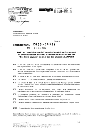 portant modification de l'autorisation de fonctionnement de l'établissement d'accueil d'enfants de moins de six ans "Les Trois Cygnes", sis au 3 rue des Cygnes à LANDSER. Resumé Pièces jointes ARRETE Assemblée : Non défini Date : 21/06/2005 Rapporteur : Non défini Collectivité : Conseil départemental du Haut-Rhin Direction : Non défini Service : Service de Protection Maternelle et Infantile Domaine : Accueil d'enfants Commission :
