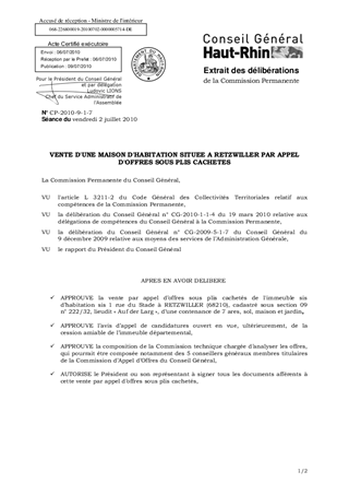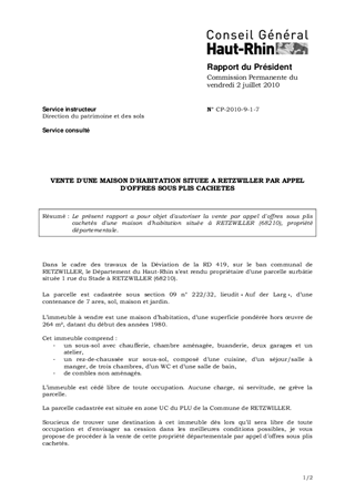 Le présent rapport a pour objet d'autoriser la vente par appel d'offres sous plis cachetés d'une maison d'habitation située à RETZWILLER (68210), propriété départementale.