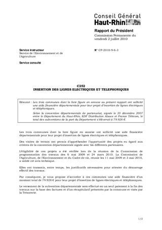 Les trois communes dont la liste figure en annexe au présent rapport ont sollicité une aide financière départementale pour leur projet d’insertion de lignes électriques et téléphoniques. Selon la convention départementale de partenariat, signée le 20 décembre 2007 entre le Département du Haut-Rhin, EDF Distribution Alsace et France Télécom, le total des subventions de la part du Département s’élèverait à 79.928 €.