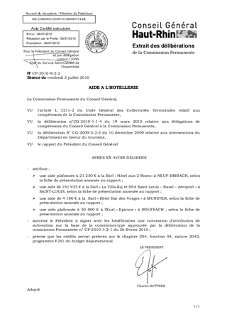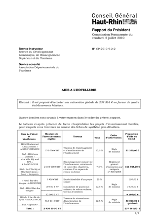 AIDE A L'HOTELLERIE Resumé Il est proposé d'accorder une subvention globale de 237 361 € en faveur de quatre établissements hôteliers. Pièces jointes DELIBERATION RAPPORT Assemblée : Commission Permanente Date : 02/07/2010 Rapporteur : Non défini Collectivité : Conseil départemental du Haut-Rhin Direction : Non défini Service : Service Développement Economique Domaine : Tourisme Commission : Commission Permanente