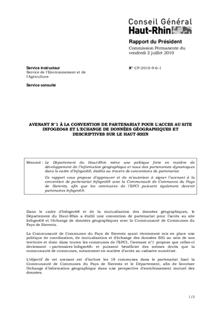 AVENANT N°1 À LA CONVENTION DE PARTENARIAT POUR L'ACCES AU SITE INFOGEO68 ET L'ECHANGE DE DONNÉES GÉOGRAPHIQUES ET DESCRIPTIVES SUR LE HAUT-RHIN