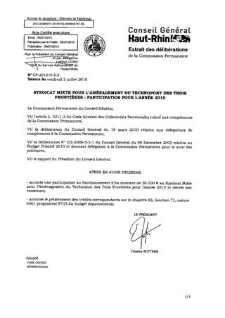 SYNDICAT MIXTE POUR L'AMENAGEMENT DU TECHNOPORT DES TROIS FRONTIERES PARTICIPATION POUR L'ANNEE 2010 Resumé Pièces jointes DELIBERATION RAPPORT Assemblée : Commission Permanente Date : 02/07/2010 Rapporteur : Non défini Collectivité : Conseil départemental du Haut-Rhin Direction : Non défini Service : Service Prospective et Aménagement Domaine : Aménagement du territoire Commission : Commission Permanente