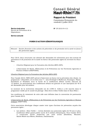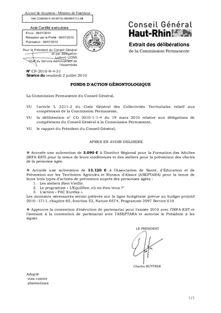 FONDS D'ACTION GÉRONTOLOGIQUE Resumé Soutien financier à des actions de prévention et de promotion de la santé en faveur des personnes âgées. Pièces jointes DELIBERATION RAPPORT Assemblée : Commission Permanente Date : 02/07/2010 Rapporteur : Non défini Collectivité : Conseil départemental du Haut-Rhin Direction : Non défini Service : Service de Prévention de la Dépendance Domaine : Social / Solidarité Commission : Commission Permanente