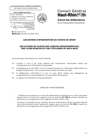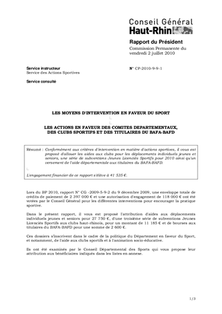 Conformément aux critères d'intervention en matière d'actions sportives, il vous est proposé d'allouer les aides aux clubs pour les déplacements individuels jeunes et seniors, une série de subventions Jeunes Licenciés Sportifs pour 2010 ainsi qu'un versement de l'aide départementale aux titulaires du BAFA-BAFD. L'engagement financier de ce rapport s'élève à 41 535 €.