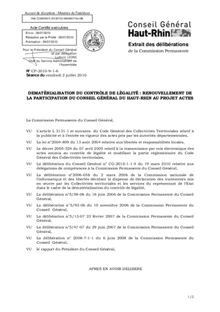 DEMATÉRIALISATION DU CONTRÔLE DE LÉGALITÉ : RENOUVELLEMENT DE LA PARTICIPATION DU CONSEIL GÉNÉRAL DU HAUT-RHIN AU PROJET ACTES