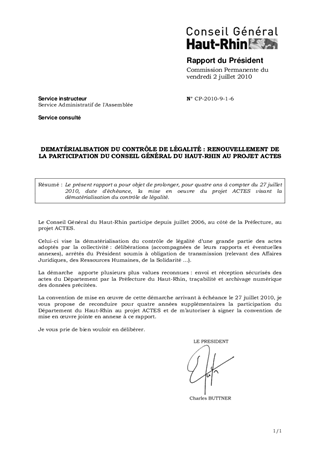 Le présent rapport a pour objet de prolonger, pour quatre ans à compter du 27 juillet 2010, date d'échéance, la mise en oeuvre du projet ACTES visant la dématérialisation du contrôle de légalité.
