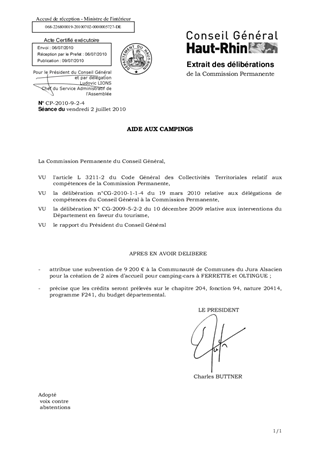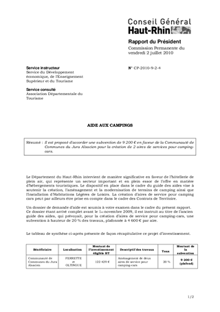 Il est proposé d'accorder une subvention de 9 200 € en faveur de la Communauté de Communes du Jura Alsacien pour la création de 2 aires de services pour camping-cars.