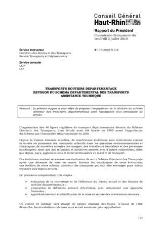 Le présent rapport a pour objet de proposer l'engagement de la révision du schéma directeur des transports départementaux avec l'assistance d'un prestataire de service.