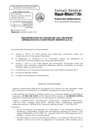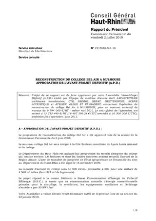 RECONSTRUCTION DU COLLEGE BEL AIR A MULHOUSE APPROBATION DE L'AVANT-PROJET DEFINITIF (A.P.D.)