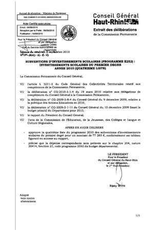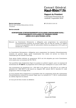 SUBVENTIONS D'INVESTISSEMENTS SCOLAIRES (PROGRAMME E252) :INVESTISSEMENTS SCOLAIRES DU PREMIER DEGREANNEE 2010 (QUATRIEME LISTE)