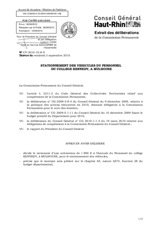 Le rapport propose le versement d'une subvention de 1800 € à l'Amicale du Personnel du collège Kennedy, à MULHOUSE, pour le stationnement des véhicules pendant l'année scolaire 2009-2010, conformément à une convention, signée en 2008. Le rapport propose également le renouvellement de cette convention, dans les mêmes conditions.