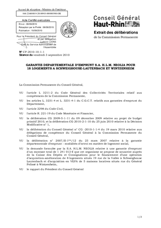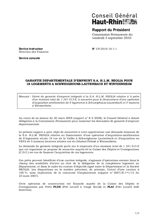 GARANTIE DEPARTEMENTALE D'EMPRUNT S.A. H.L.M. NEOLIA POUR 18 LOGEMENTS A SCHWEIGHOUSE-LAUTENBACH ET WINTZENHEIM