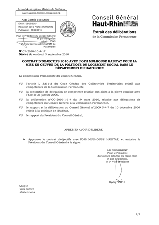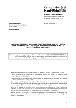 CONTRAT D'OBJECTIFS 2010 AVEC L'OPH MULHOUSE HABITAT POUR LA MISE EN OEUVRE DE LA POLITIQUE DU LOGEMENT SOCIAL DANS LE DÉPARTEMENT DU HAUT-RHIN
