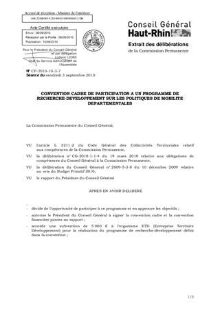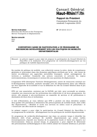 Le présent rapport a pour objet de proposer la participation du Conseil Général du Haut-Rhin à la réalisation d’un programme de recherche-développement sur les politiques de mobilité départementale.