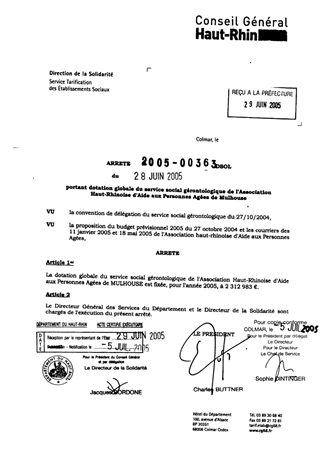 portant dotation globale du service social gérontologique de l'Association Haut-Rhinoise d'Aide aux personnes âgées de MULHOUSE. Resumé Pièces jointes ARRETE Assemblée : Non défini Date : 28/06/2005 Rapporteur : Non défini Collectivité : Conseil départemental du Haut-Rhin Direction : Non défini Service : Service de la Tarification des Etablissements Domaine : Personnes Agées Commission :