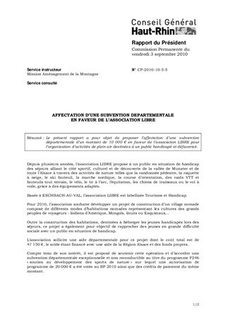 Le présent rapport a pour objet de proposer l’affectation d’une subvention départementale d’un montant de 10 000 € en faveur de l’association LIBRE pour l’organisation d’activités de plein air destinées à un public handicapé et défavorisé.