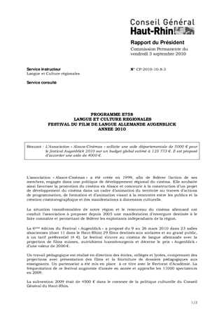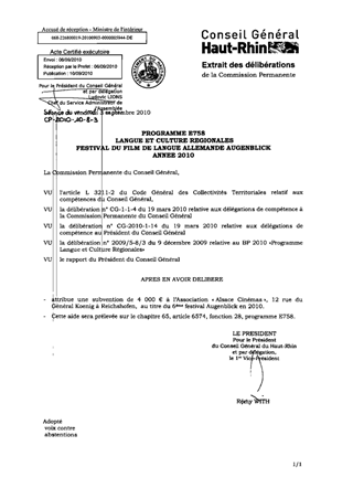 L’Association « Alsace-Cinémas » sollicite une aide départementale de 5000 € pour le festival Augenblick 2010 sur un budget global estimé à 125 773 €. Il est proposé d’accorder une aide de 4000 €.