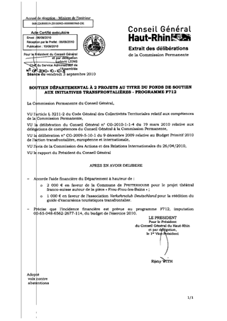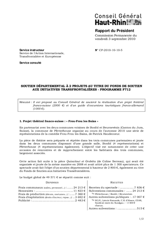 Il est proposé au Conseil Général de soutenir la réalisation d'un projet théâtral franco-suisse (2000 €) et d'un guide d'excursions touristiques franco-allemand (1000 €).