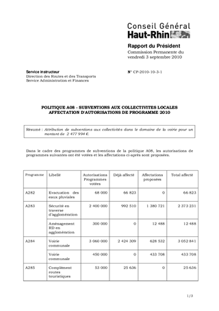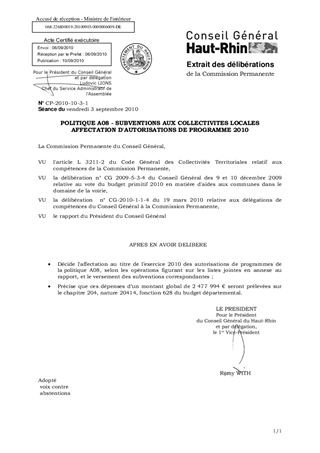 POLITIQUE A08 - SUBVENTIONS AUX COLLECTIVITES LOCALES AFFECTATION D'AUTORISATIONS DE PROGRAMME 2010