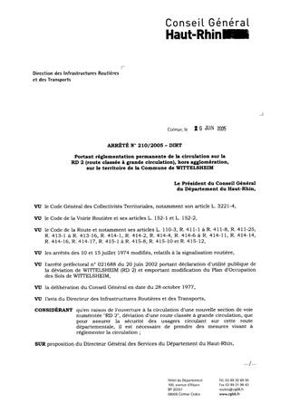 portant réglementation permanente de la circulation sur la RD 2 (route classée à grande circulation), hors agglomération, sur le territoire de la commune de WITTELSHEIM. Resumé Pièces jointes ARRETE Assemblée : Non défini Date : 29/06/2005 Rapporteur : Non défini Collectivité : Conseil départemental du Haut-Rhin Direction : Non défini Service : Direction des Routes Domaine : Circulation Commission :